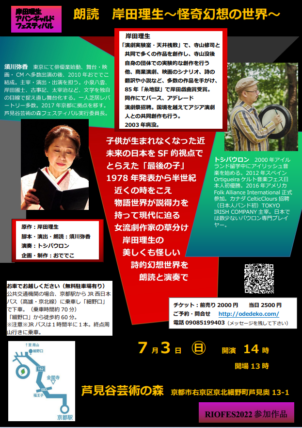 作者の岸田理生さんは、多読で、あらゆるジャンルの書物を読んでいたと言われます。当然その脳内には書物からの情報が無数に蓄えられていたのはもちろんですが、そこからさらに発展させた想像力の逞しさに驚嘆します。いつかの未来として書かれたはずが、遠い過去の神話のようにも、進行中の現代のようにも思えて来る。怖くて不思議で美しくも怪しい詩的言語世界を、朗読と生演奏のコラボレーションで堪能して下さい。